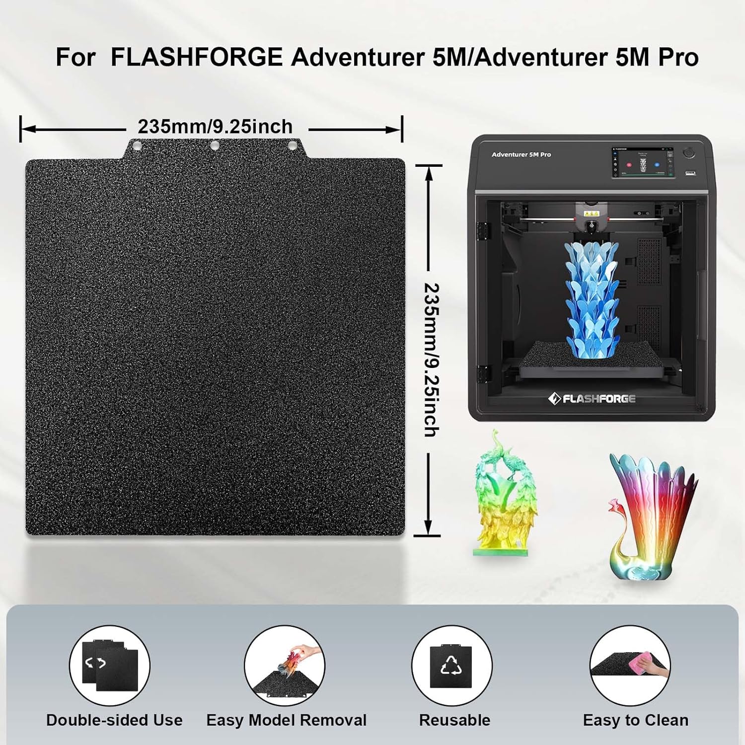 IdeaFormer Double-Sided Textured Black PEI Spring Steel Build Plate, 235x235mm for Flashforge Adventurer 5M/5M Pro/AD5X
